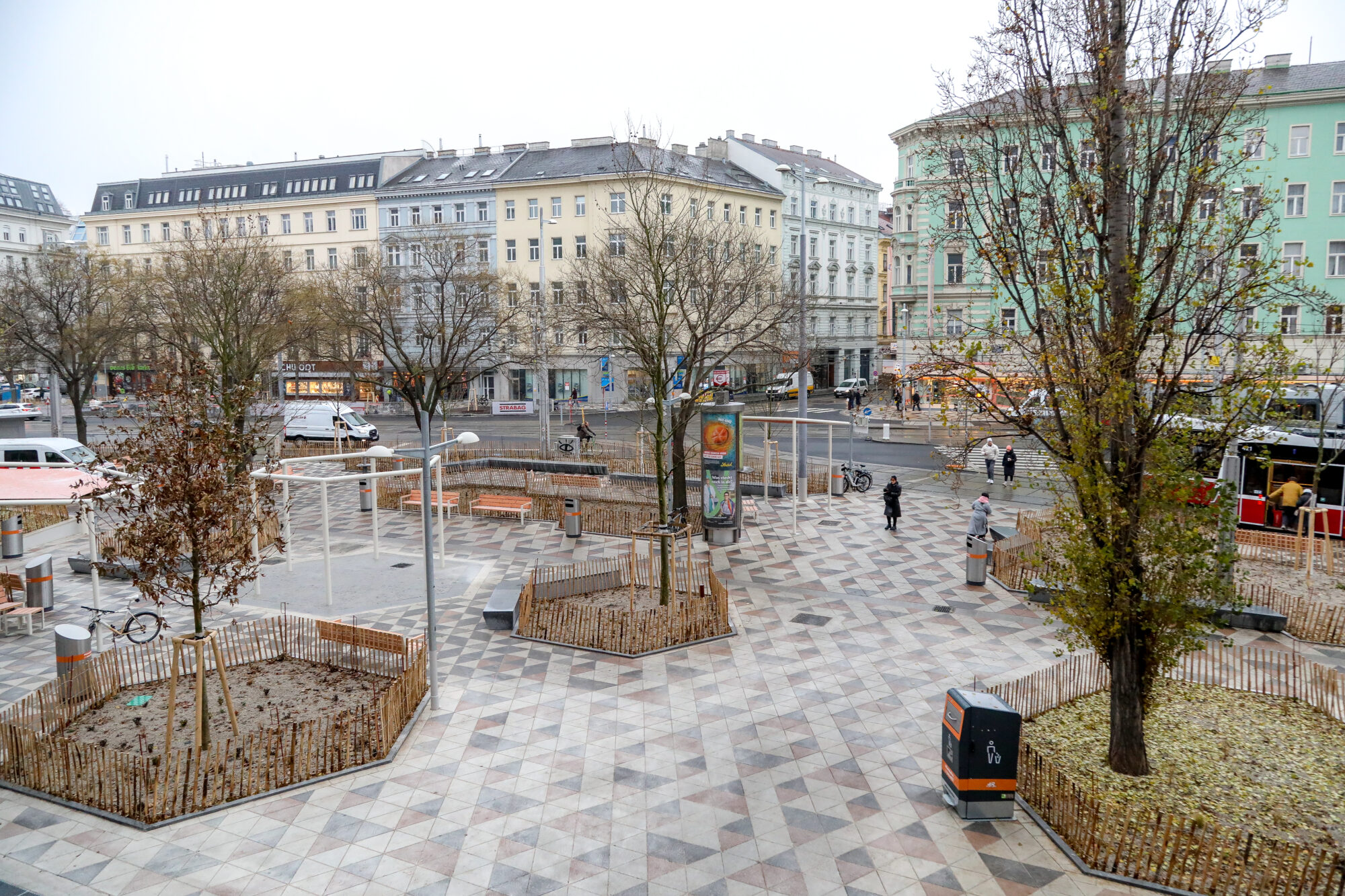 Die gesamte Projektfläche des Julius-Tandler-Platzes (inklusive Nordbergstraße bis zum Spittelauer Platz) beträgt satte 8.000 Quadratmeter, auf denen entsiegelt und begrünt wurde. Das Bündel an Maßnahmen: 46 neue Bäume wurden alleine am Platz gepflanzt, darunter etliche großkronige XL-Bäume. Diese brauchen jetzt noch etwas Zeit zum Wachsen. Ab dem nächsten Frühjahr werden sie für Kühlung und Farbtupfer auf dieser vormals trostlosen Asphaltfläche sorgen. Die Grünfläche wurde von 21 auf 2.140 Quadratmeter verhundertfacht! Sessel, Bänke, Baldachine, Wasserspiele und Trinkbrunnen werten den Platz zusätzlich auf.