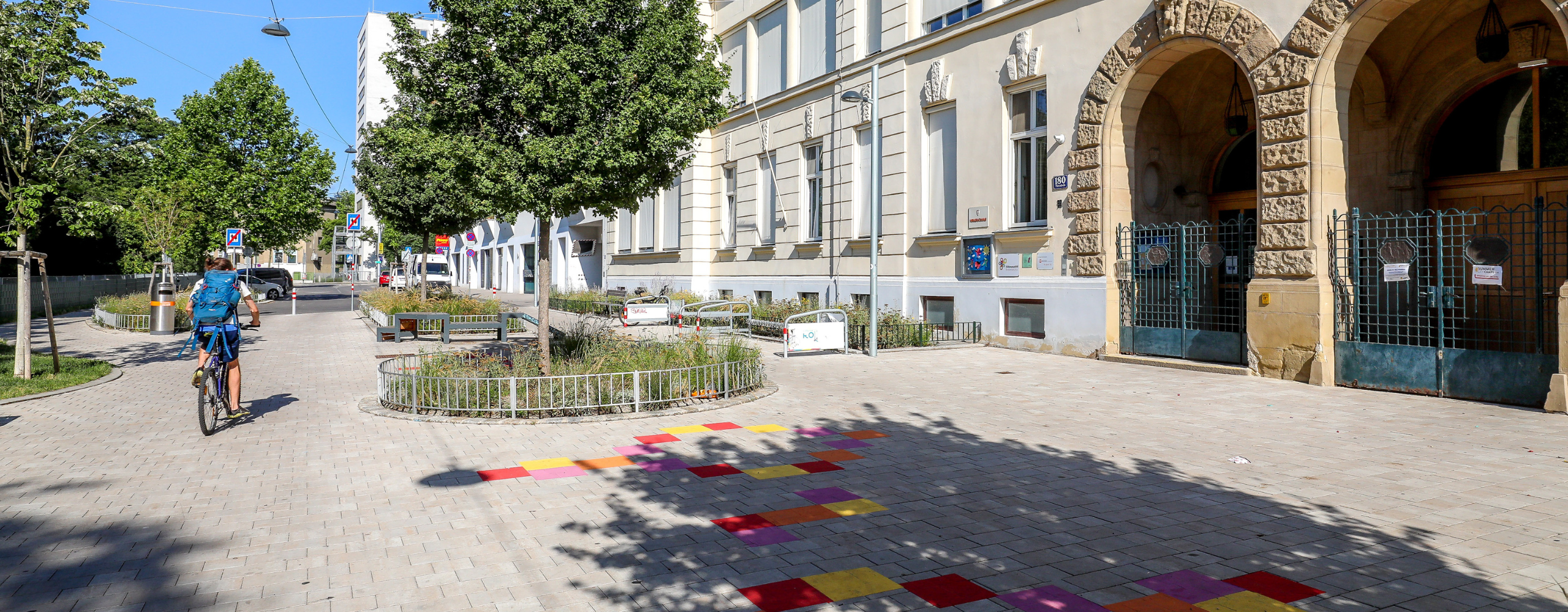 - Der Bereich vor der Schule in der Ottakringer Panikengasse wurde im Dezember 2023 fertig gestaltet. In der Straße, durch die die Straßenbahn Linie 9 fährt, gibt’s direkt vor dem Schuleingang nun einen breiten Gehsteig, neue Bäume sowie einen Trinkhydranten. Auch die angrenzende Straßenbahnhaltestelle wurde neugestaltet und bietet mehr Platz für Zu-Fuß-Gehende.