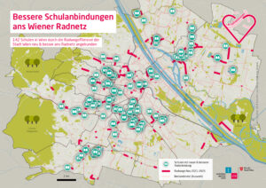 Besonders hervorzuheben sind die Verbesserungen beim Anschluss an das Radnetz. Zwischen 2021 und 2025 wurden 142 Schulen neu an sichere Radwege und Fahrradstraßen angebunden. Heute sind 70 Prozent aller Volksschulen an das Wiener Hauptradwegenetz angeschlossen, 30 Prozent sogar an besonders kinderfreundliche Strecken – also Bereiche, die entweder gänzlich verkehrsberuhigt oder mit baulich getrennten Radwegen ausgestattet sind.