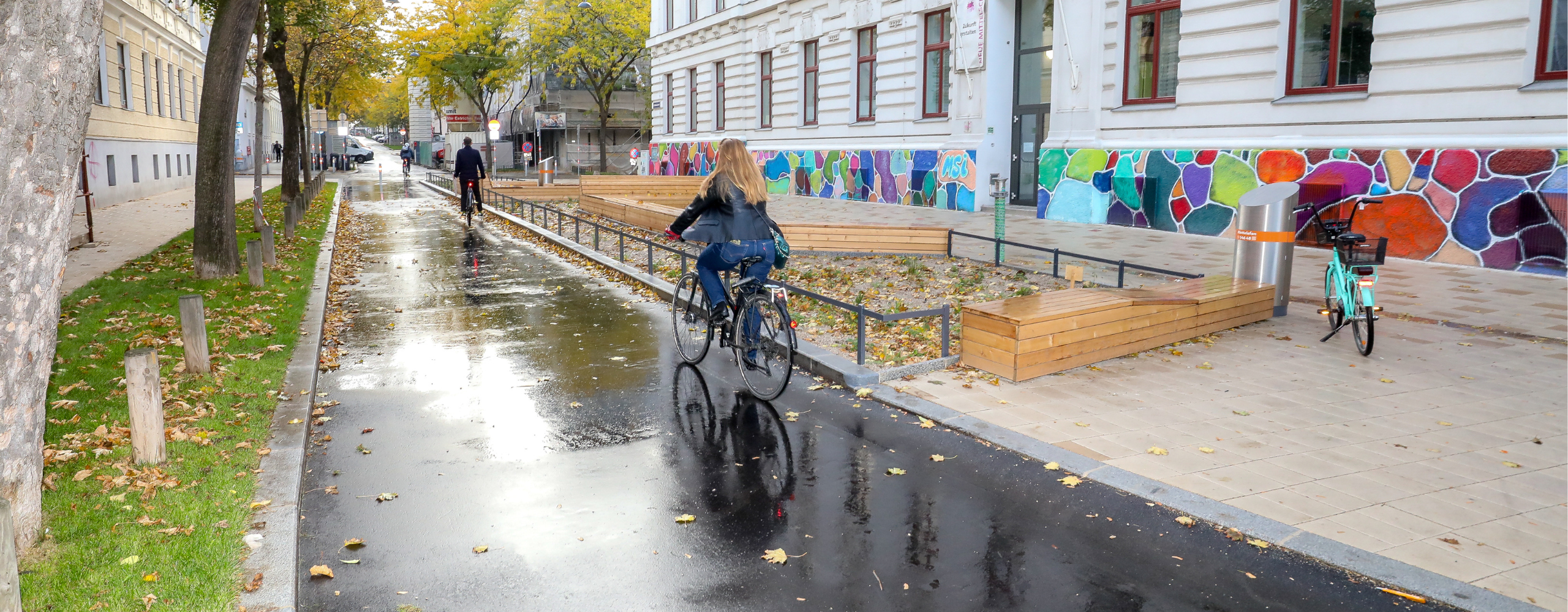 Während die Baumpflanzungen nach und nach im kühlen Herbst stattfinden, damit die Bäume optimale Bedingungen zum Anwurzeln haben, sind sowohl Radweg als auch Fahrradstraße bereits befahrbar. Eine wunderbar durchgehende, komfortable Verbindung vom Gürtel durch den 15. und weit hinein in den 14. Bezirk!