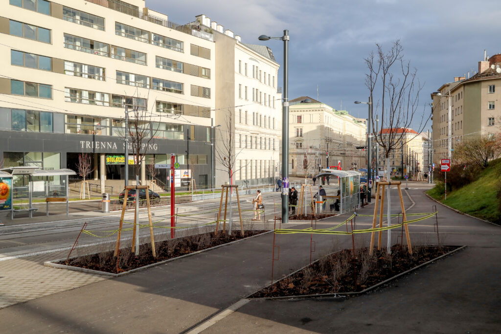 Zusätzlich wurden rund 1.000 Quadratmeter neue Grünflächen errichtet und 33 neue Bäume gepflanzt – als erster Teil von insgesamt rund 200, die entlang der Verlängerung der Linie 18 bis zur U2-Station Stadion neu dazukommen.